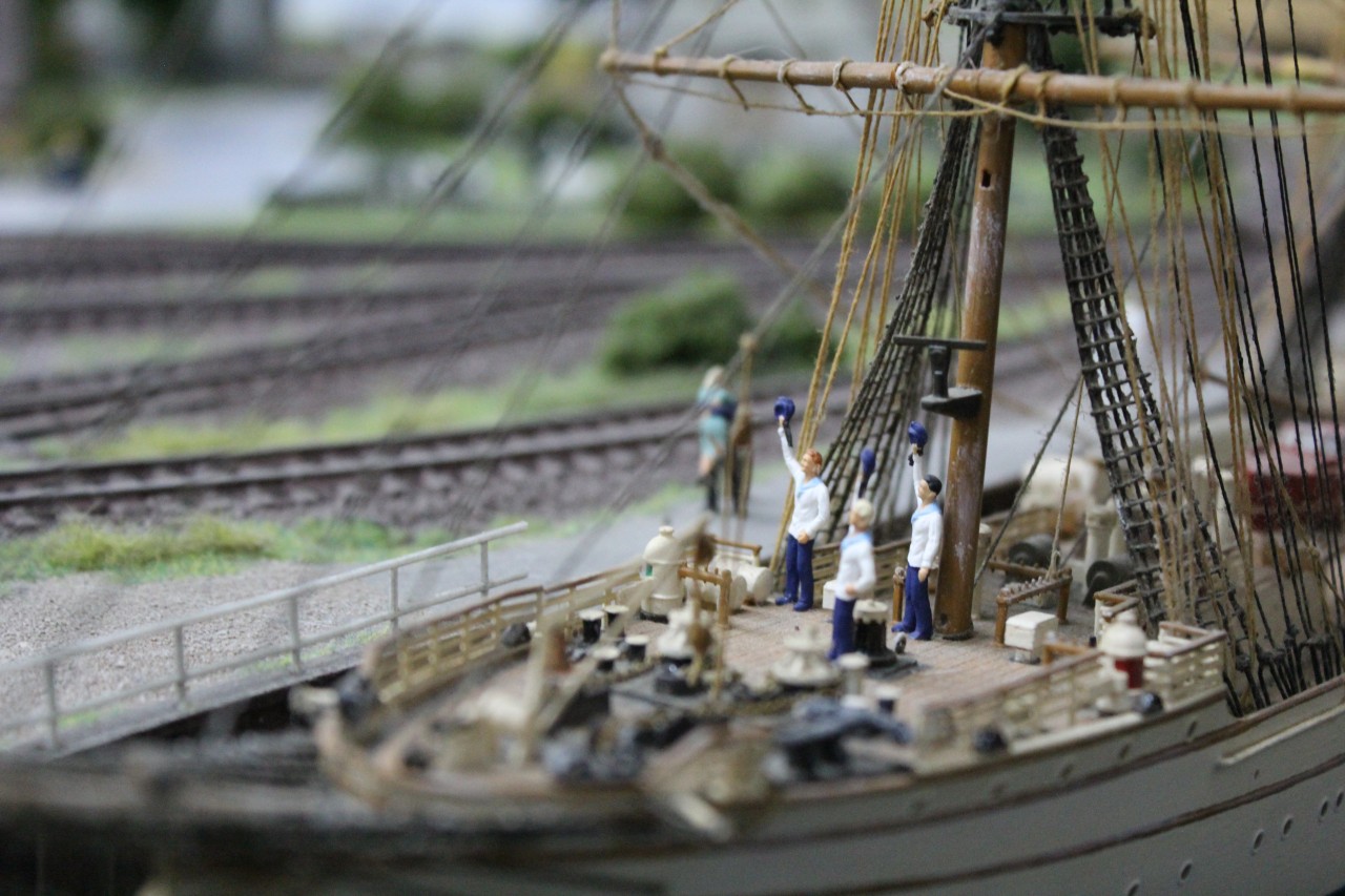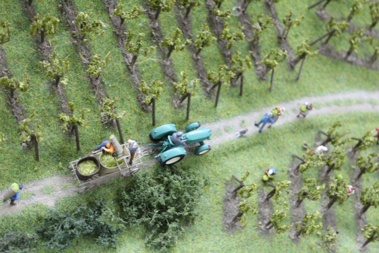 Mit einigen Knopfdruck-Aktionen kann man hier auch selber aktiv werden und Animationen auf der Modellbahn auslösen. Ebenso kann man selber per Knopfdruck alle Zuggarnituren manuell in Gang setzen. Dazu zählen neben einem Intercity der Baureihe 103, Dieselloks, Dampfloks, u.a. auch eine Köf, ein TEE oder der Rheingold-Express inkl. Dampflok aus dem 1950er Jahren. Die Zuglängen gehen bis 3,50 Meter Länge und bilden so einen realistischen Zugverkehr ab.