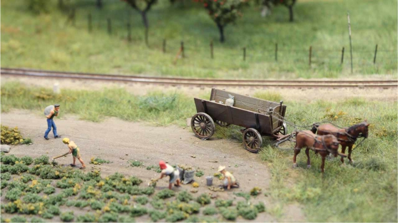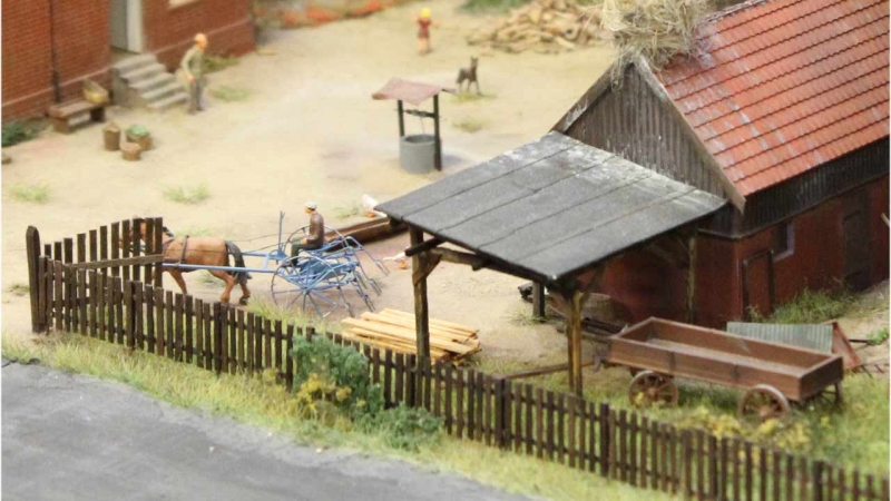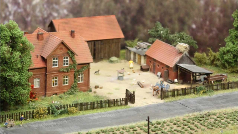 Fast alle Modelle entstanden im Selbstbau. Das Bauernhaus entstand aus einem kibri-Bausatz. Die nach hinten offene Scheune entstand komplett im Eigenbau. Der Stall basiert auf einem Bausatz vom niederländischen Hersteller artitec.