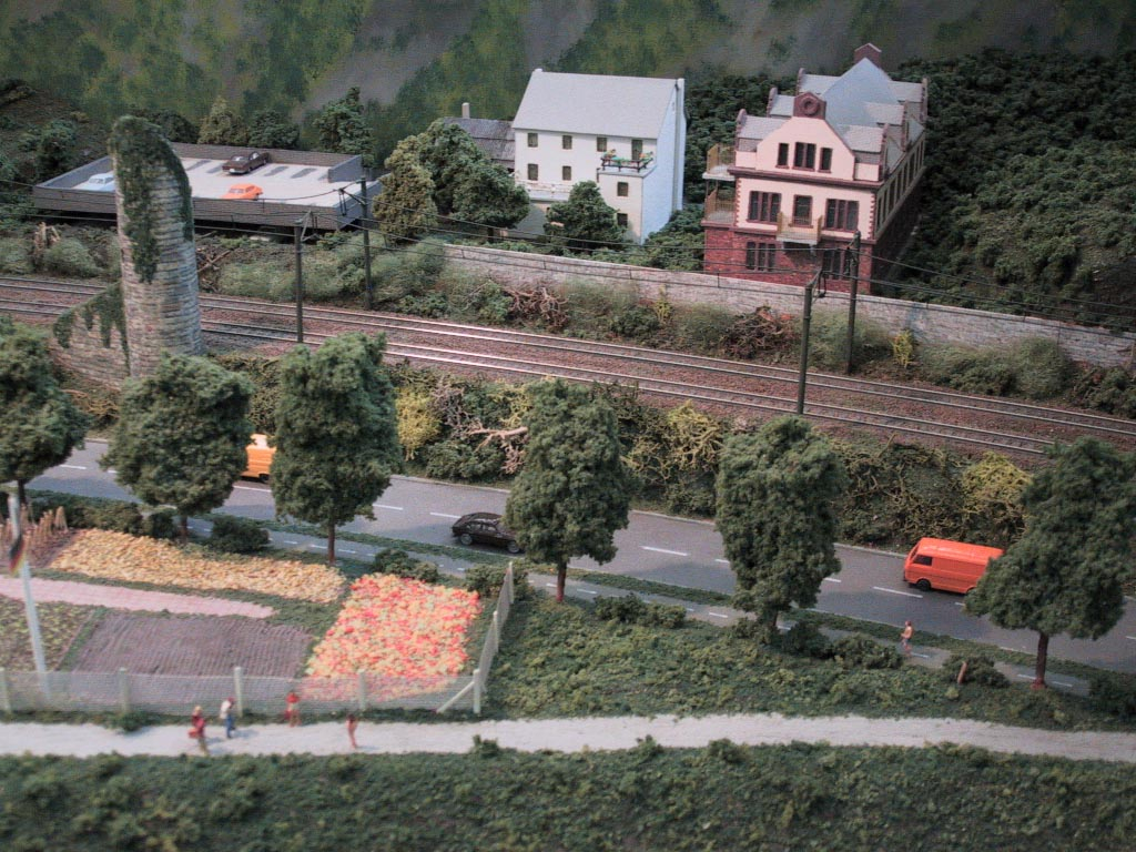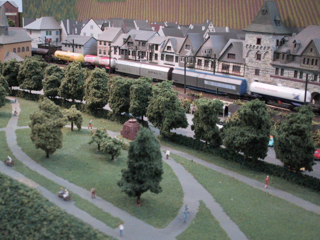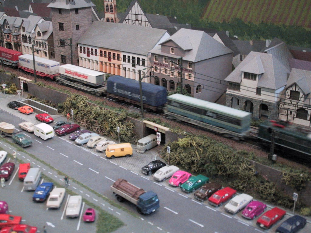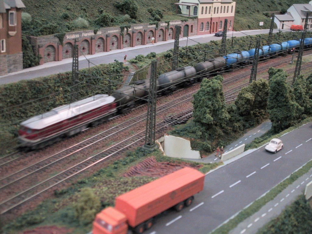 Bacharach ist eine Kleinstadt 130 km südlich von Köln am Westufer des Rhein. Diese Weinstadt ist Vorbild dieser Spur N-Anlage. Verbaut wurde hier Peco-Gleis Code 55. Die Schienen wurden mit Rostfarbe patiniert und dunkel eingeschottert. Die Oberleistung ist von Sommerfeldt und nicht funktionsfähig. Die Bäume sind ein Selbstbau aus Cocktail-Stäbchen die mit Woodland Scenics überzogen wurden. Die meisten Gebäude sind selbst gebaut aus Polystyrene, Balsa-Holz, Plastik sowie Karton. Rollendes Material stammt von Arnold, Fleischmann, Roco und Minitrix.