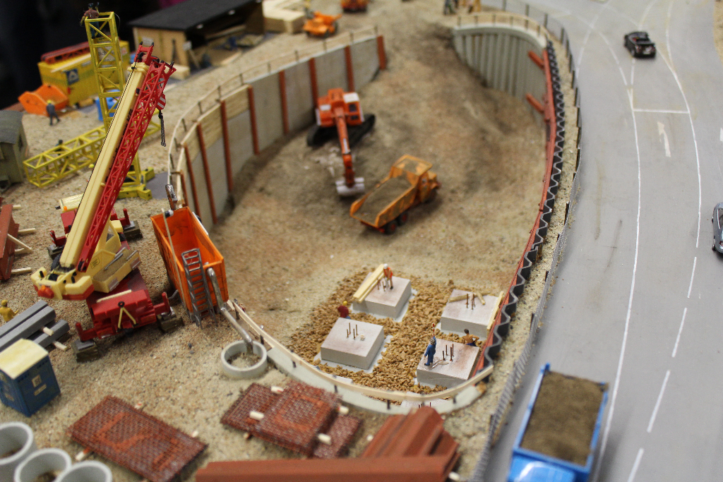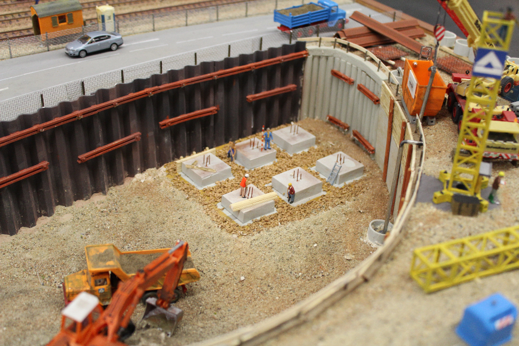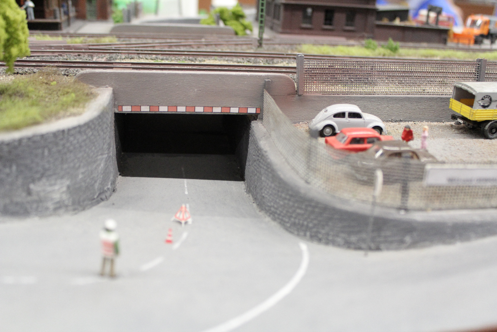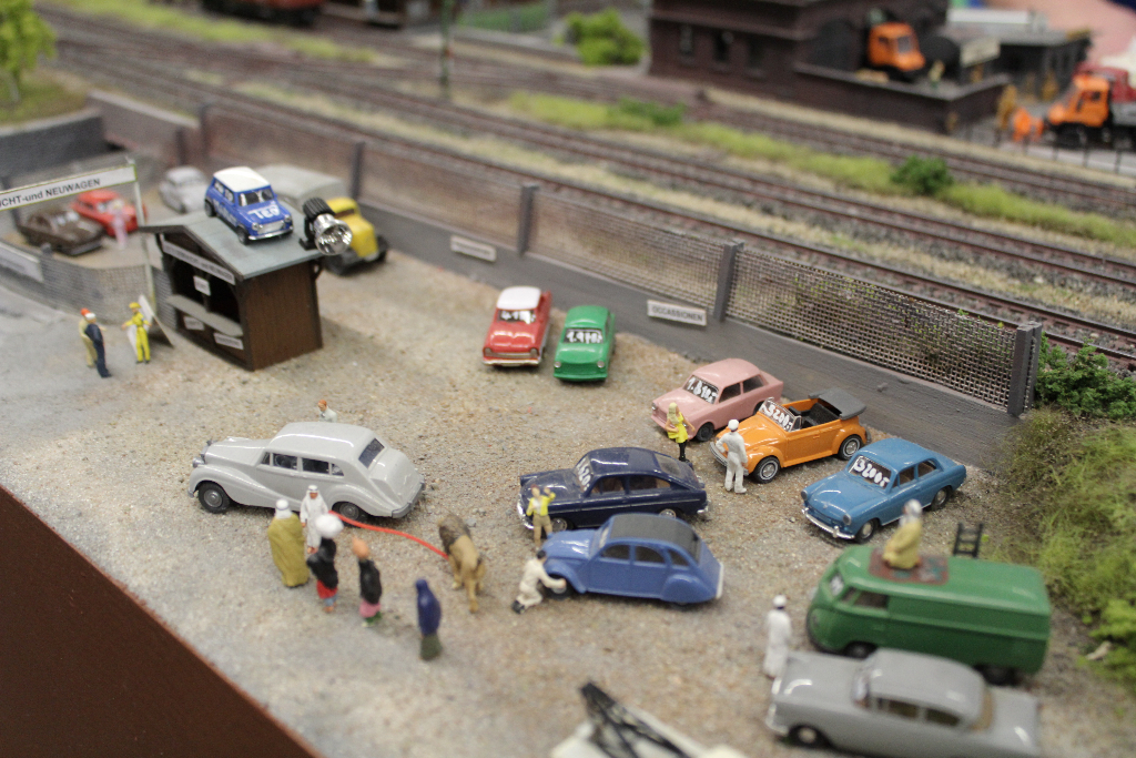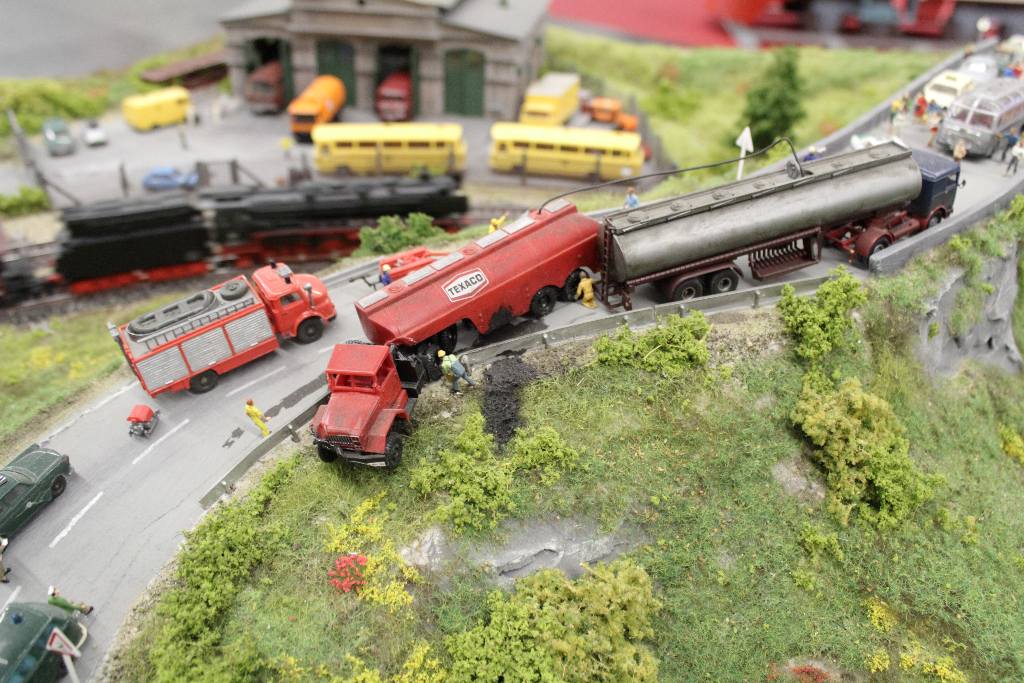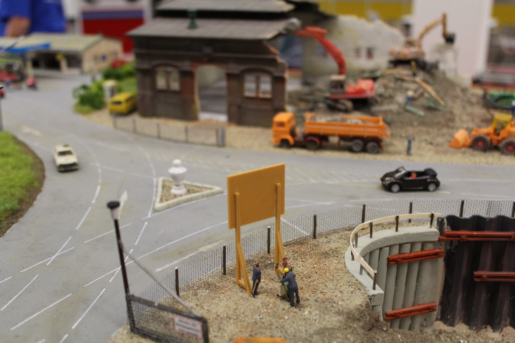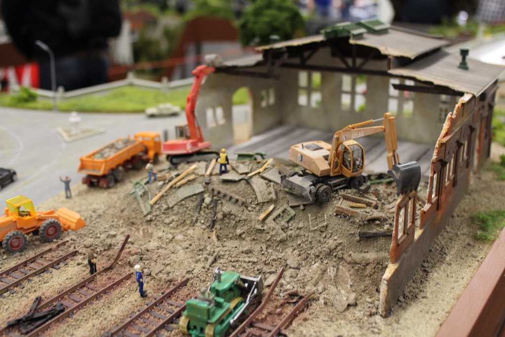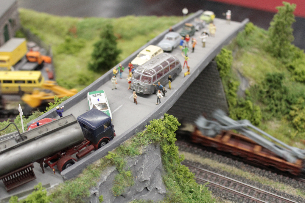 Zu den Motiven auf der Anlagen gehören u.a. ein Verkehrsunfall mit einem Tanklaster, ein Wochenmarkt in der Stadt, ein Vorstadtbahnhof, eine große Baustelle mit Tiefbau, Abriss eines BW mit Abrissbaggern, Güterschuppen, Bekohlungsanlage, Dieseltanklager, Drehscheibe und viele weitere Details und Ausschmückungen.