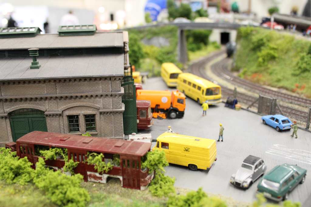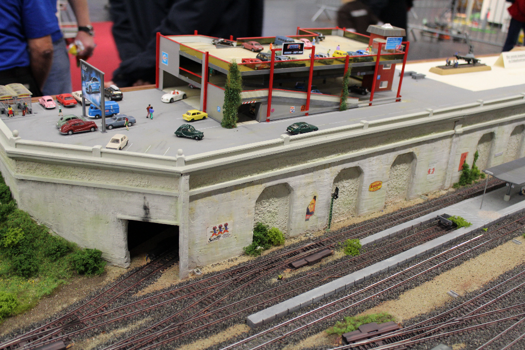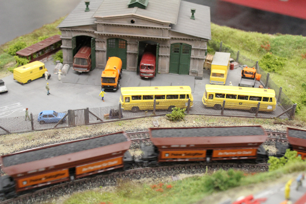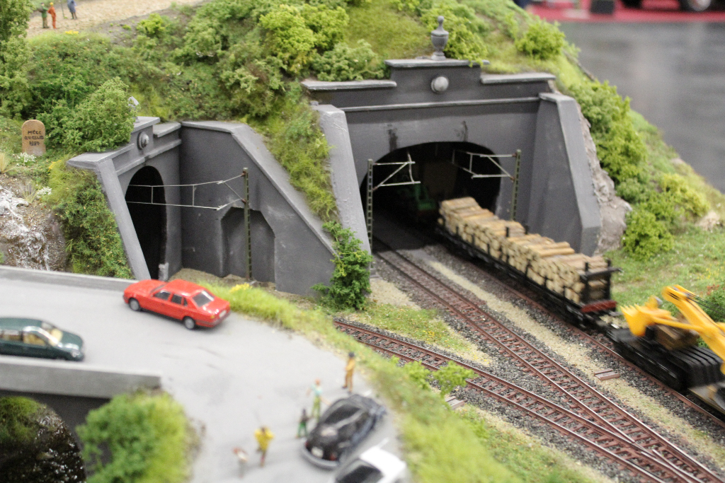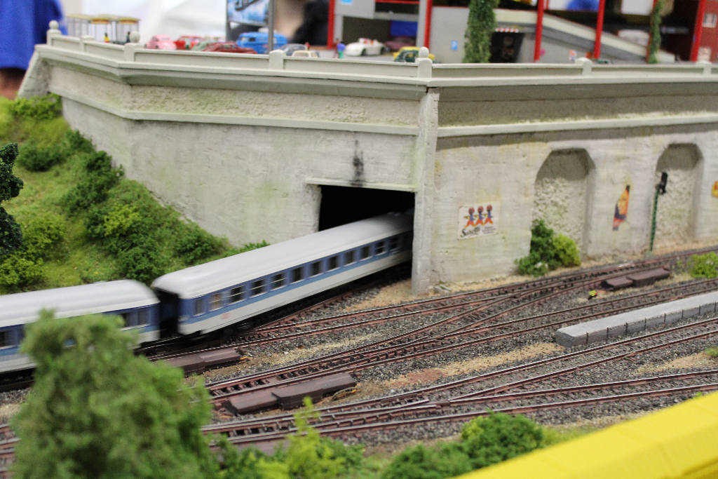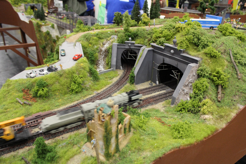 Zwei der Lokomotiven können vom Zuschauer per Knopfdruck gestartet werden. Als rollendes Material kommen Lokmodelle und Wagons von Märklin, Roco und Piko zum Einsatz.