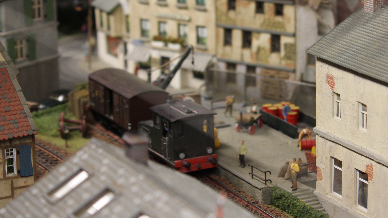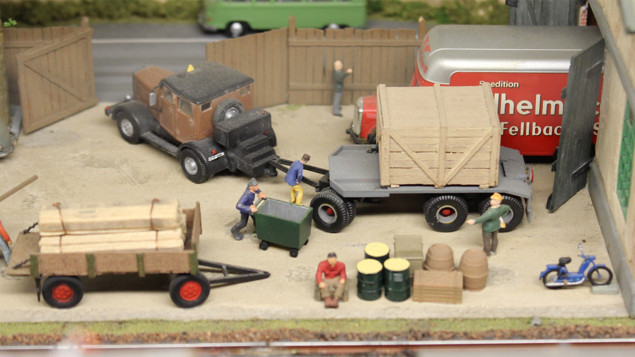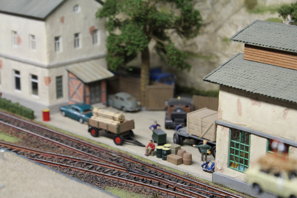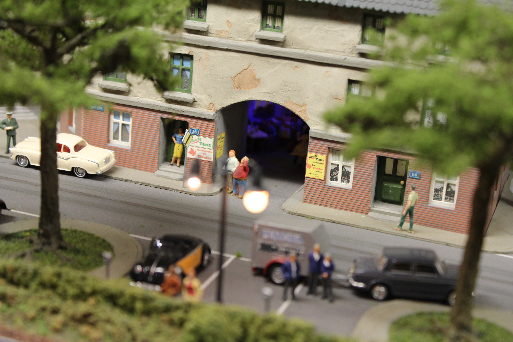 Dazu gehört der Fahrdienstleiter, der den Kopf bewegt, die Modellbahnanlage im Schaufenster, Tanz, sich bewegende Maschinen, einparkende LKW inkl. Einweiser, ein Auto auf einer Hebebühne, eine gehiesste Flagge, eine Abrissbirne, die gegen eine Wand hämmert, ein Auto auf einer Drehplattform im Schaufenster, eine Wanduhr mit sich bewegendem Pendel und vieles mehr. Schauen Sie doch mal, was sie alles entdecken.